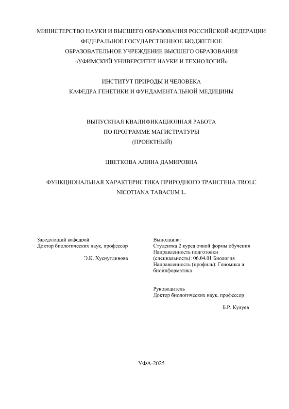 ВКР; магистратура; агробактерии; природно-трансгенные растения; Nicotiana tabacum L.; трансген trolC
