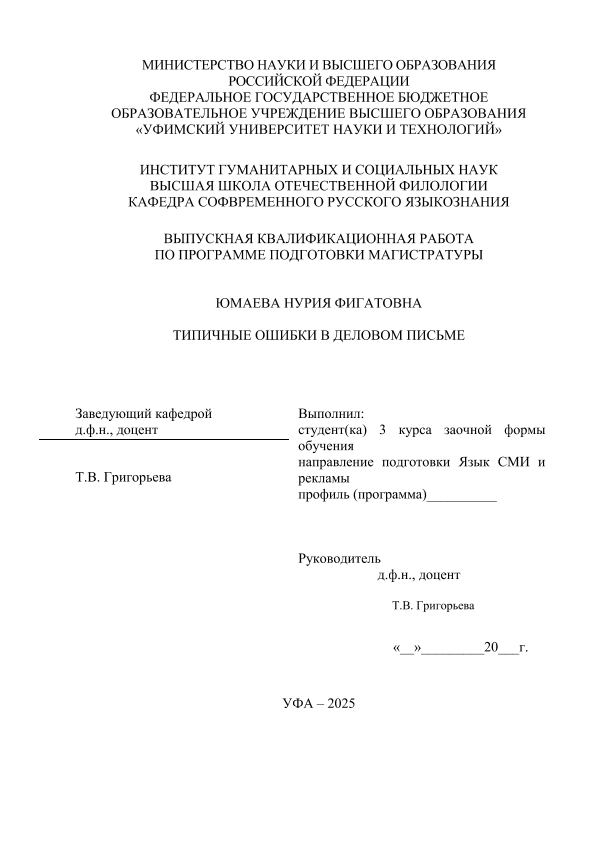 ВКР; магистратура; официально-деловой стиль; описание типичных ошибок; формирование деловой коммуникации; текст документов