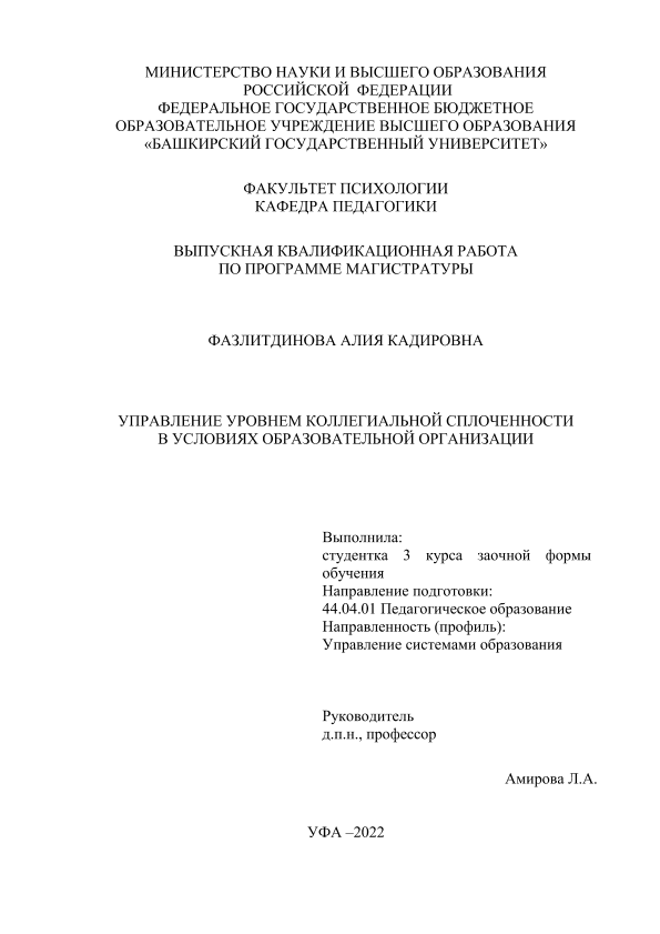 Образование. Педагогика — Организация образования; ВКР; магистратура; педагогические коллективы; коллегиальная сплоченность; дошкольные образовательные организации