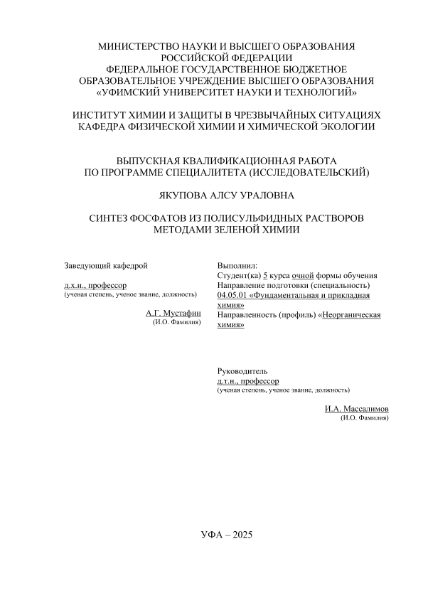 специалитет; ВКР; синтез фосфатов; полисульфиды щелочноземельных металлов; принципы зелёной химии; ИК-спектры; экстракт кожуры граната; полисульфид кальция; барий