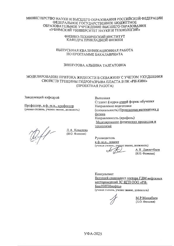 Subjects: ВКР; бакалавриат; трещина гидроразрыва пласта; скважины; приток жидкости; затухание; численное моделирование