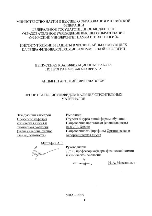Subjects: ВКР; бакалавриат; сера; свойства полисульфидов; синтез; пропитка; строительные материалы