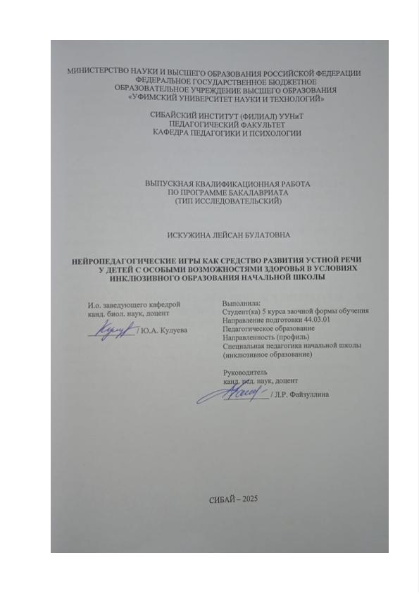 Специальная педагогика начальной школы (инклюзивное образование); бакалавриат; ВКР; речи; ОВЗ; игры