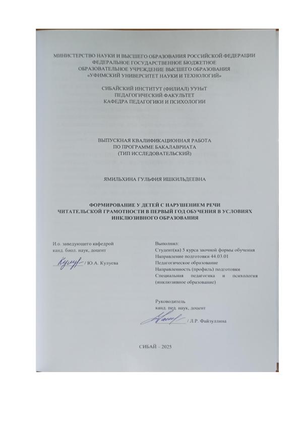 Специальная педагогика начальной школы (инклюзивное образование); бакалавриат; ВКР; грамотность; речи; формирование