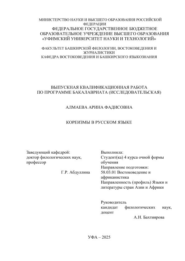 ВКР; бакалавриат; корейский язык; кореизмы; языковое заимствование; русский язык; лексикология