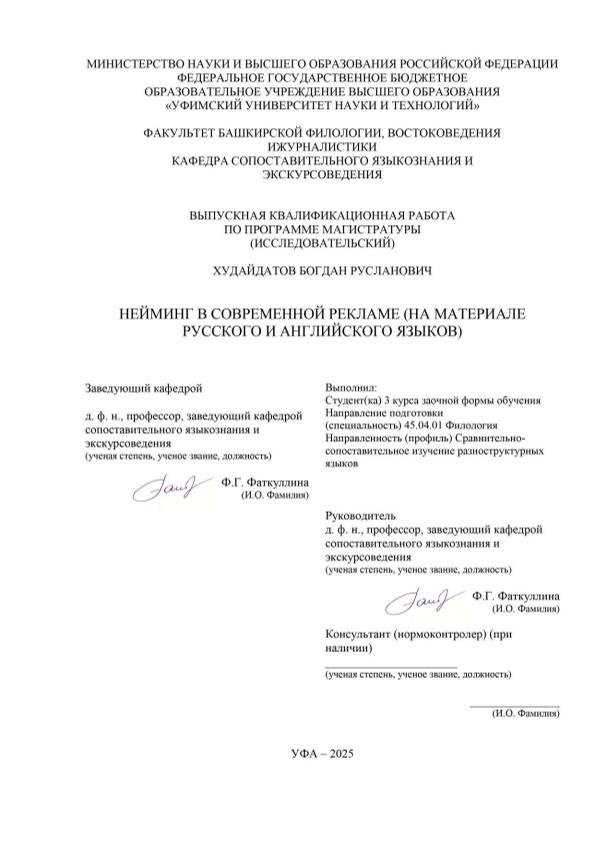 ВКР; магистратура; реклама; нейминг; русский язык; английский язык; семантический анализ; сопоставительный анализ; межъязыковой нейминг