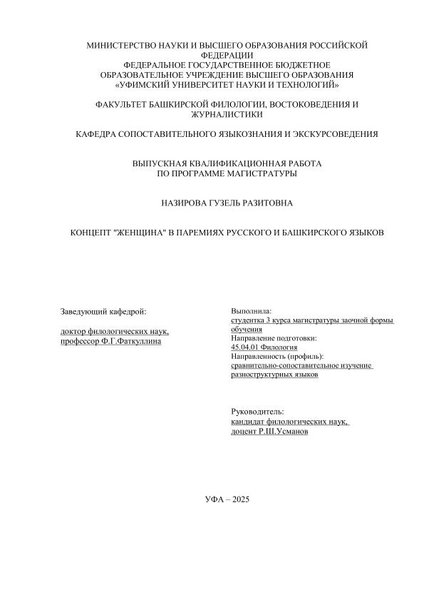 ВКР; магистратура; русский язык; башкирский язык; концепт "женщина"; языковая картина мира; паремии; лингвокультурология; пословицы