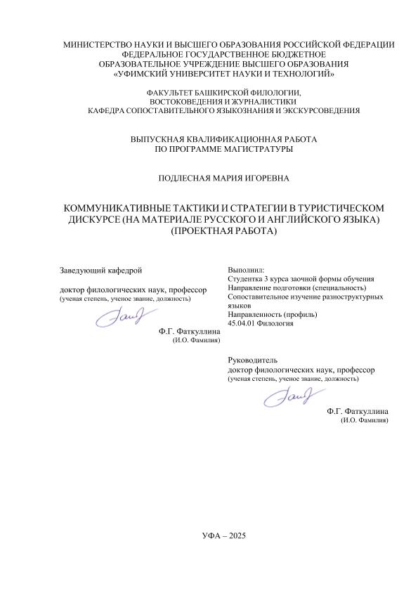 ВКР; магистратура; русский язык; английский язык; туристический дискурс; коммуникативные тактики; справочный материал