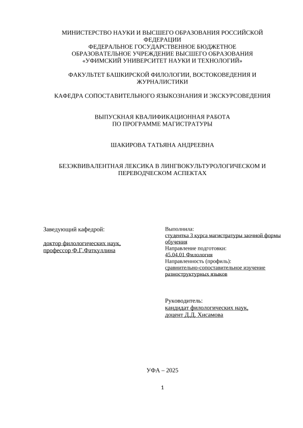 ВКР; магистратура; языковая безэквивалентность; безэквивалентная лексика; перевод; английский язык; русский язык