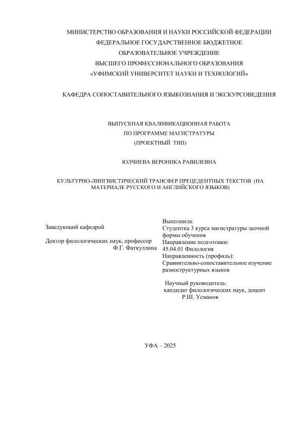 ВКР; магистратура; прецедентные тексты; туристический дискурс; экскурсионные тексты; английский язык; русский язык; лингвопереводческие особенности