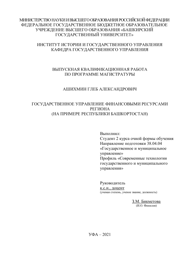 Право — Управление социально-культурной сферой; ВКР; магистратура; финансовые ресурсы региона; система управления; совершенствование государственного управления; бюджет Республики Башкортостан
