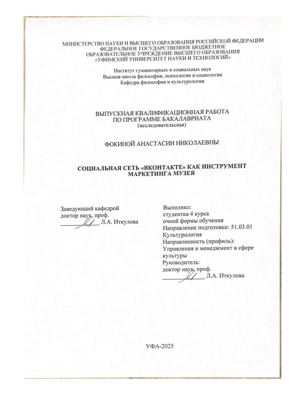 ВКР; бакалавриат; социальные сети; маркетинга культурных учреждений; «ВКонтакте»; маркетинговая стратегия музея; Национальный музей Республики Башкортостан