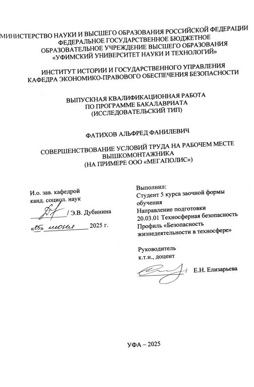 ВКР; бакалавриат; условия труда; охрана труда; вышкомонтажники; вредные факторы