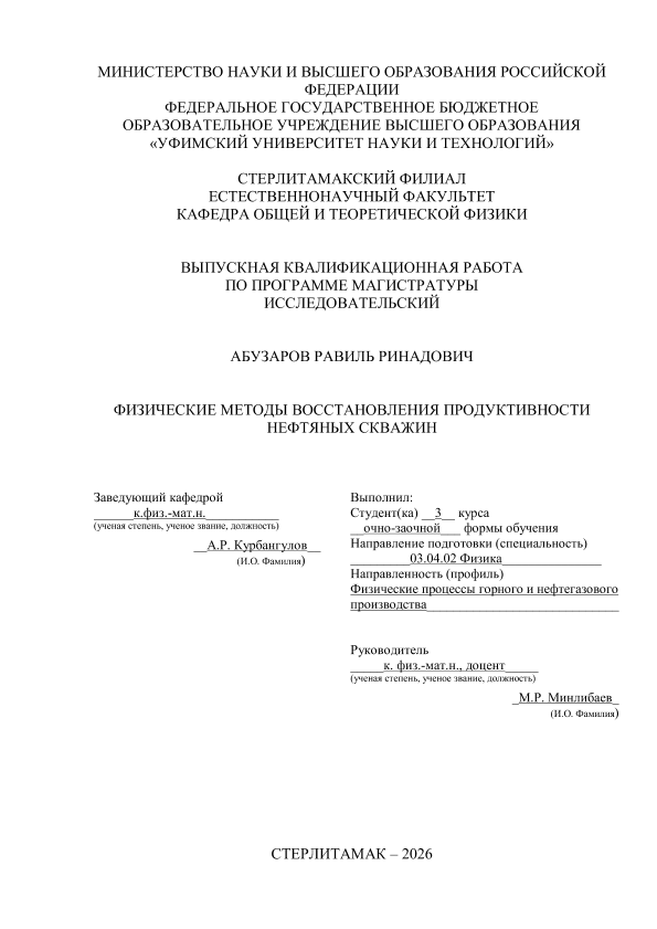 Физика; магистратура; ВКР (исследовательский тип); нефтяные скважины