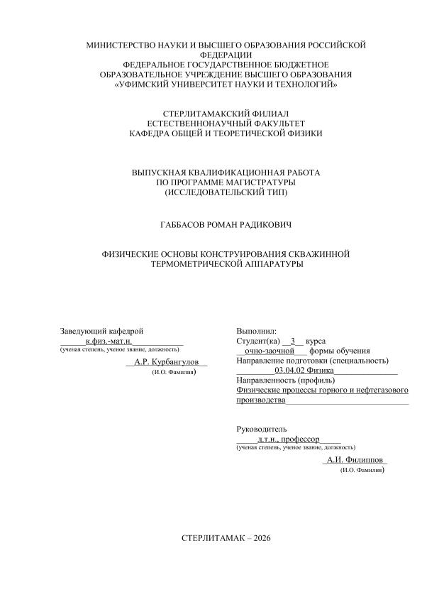 Физика; магистратура; ВКР (исследовательский тип); скважинная термометрическая аппаратура