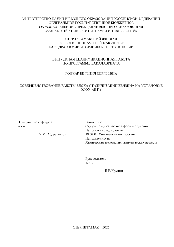 Химическая технология; бакалавриат; ВКР; блок стабилизации бензина