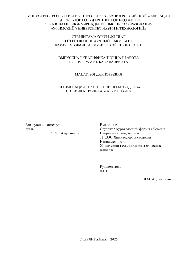 Химическая технология; бакалавриат; ВКР; полиэлектролит марки ВПК-402
