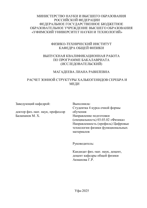 ВКР; бакалавриат; халькогениды серебра; халькогениды меди; зонная структур; фазовые переходы; кристаллическая решетка; численное моделирование