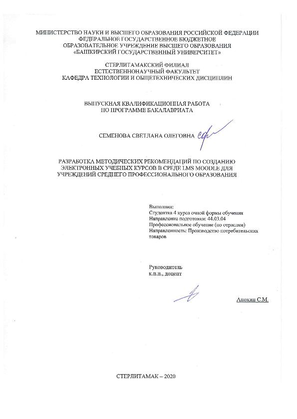 Профессиональное обучение; Производство потребительских товаров; бакалавриат; ВКР; электронный учебный курс; среда LMS MOODLE; среднее профессиональное образование