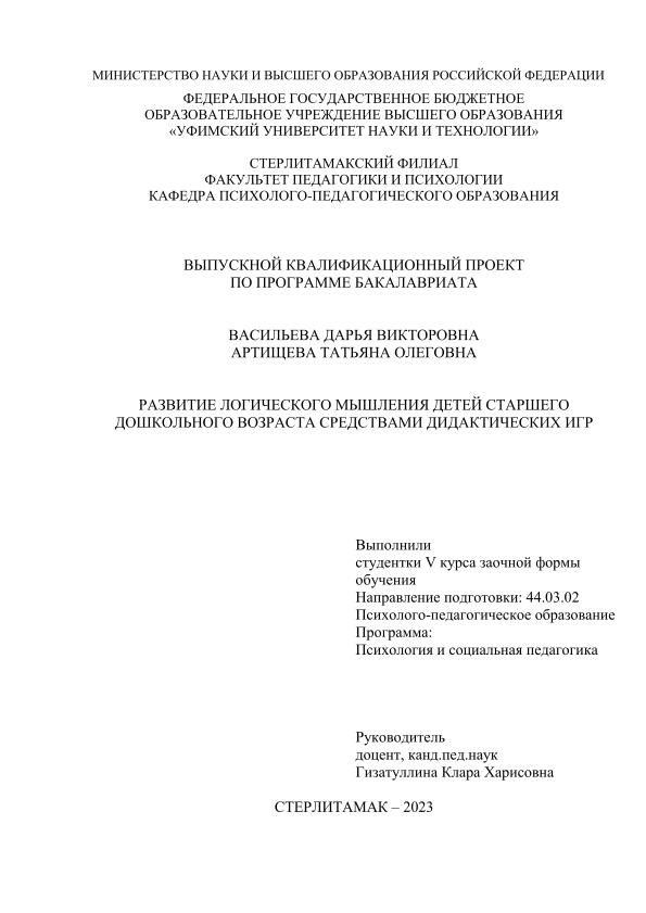 Психолого-педагогическое образование; Психология и социальная педагогика; бакалавриат; ВКР; логическое мышление детей; дидактические игры; старший дошкольныйвозраст