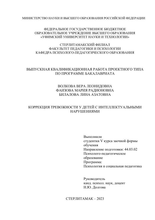 Психолого-педагогическое образование; Психология и социальная педагогика; бакалавриат; ВКР; тревожность у детей; интеллектуальные нарушения; гуманизация школьного образования