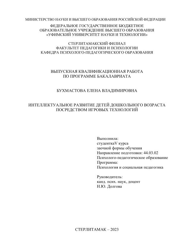 Психолого-педагогическое образование; Психология и социальная педагогика; бакалавриат; ВКР; дети дошкольного возраста; интеллектуальное развитие детей