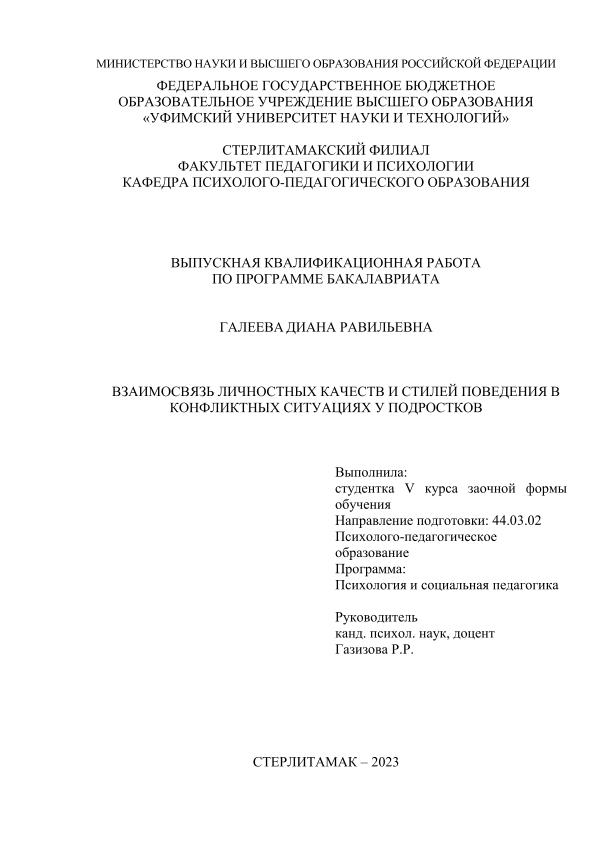 Психолого-педагогическое образование; Психология и социальная педагогика; бакалавриат; ВКР; поведение в конфликтных ситуациях; подростковый возраст; личностные качества подростков
