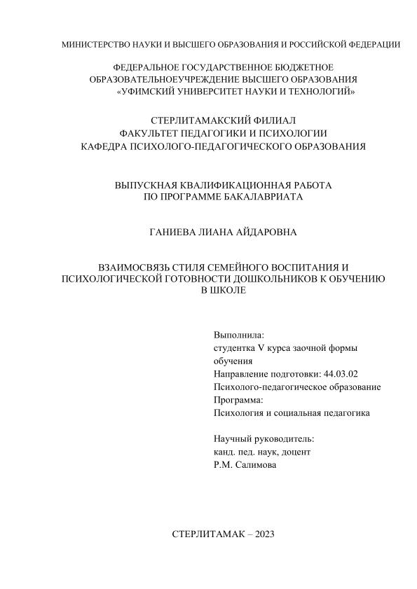 Психолого-педагогическое образование; Психология и социальная педагогика; бакалавриат; ВКР; семейное воспитание; готовность к обучению в школе; дошкольник