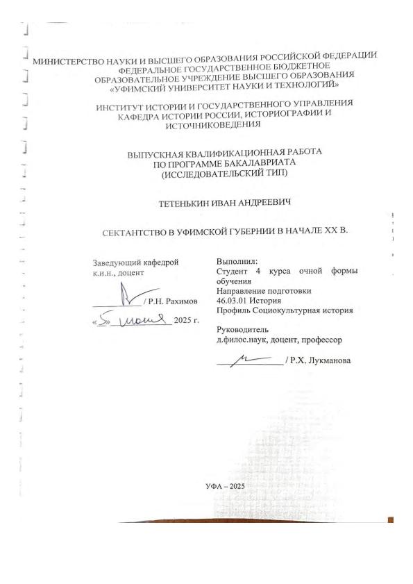 ВКР; бакалавриат; сектантство; Уфимская губерния; губернские власти; мнение российской общественности; юридический статус