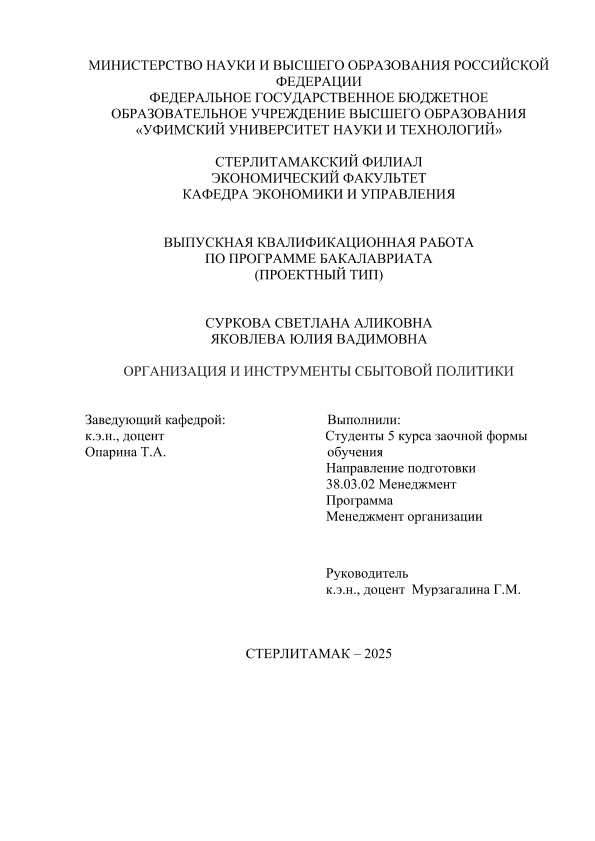Экономика; бакалавриат; ВКР; сбытовая политика