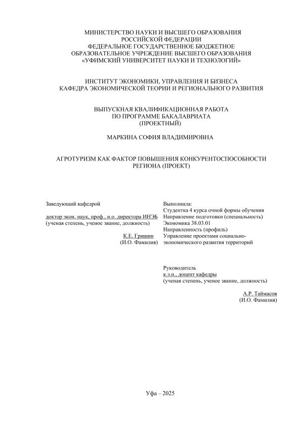 ВКР; бакалавриат; агротуризм; конкурентоспособность региона; экономика региона; социально-экономический эффект; Республика Башкортостан