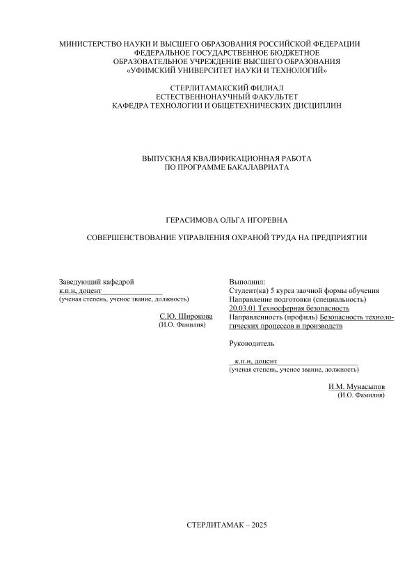 Охрана труда; бакалавриат; ВКР; управления охраной труда