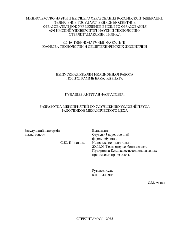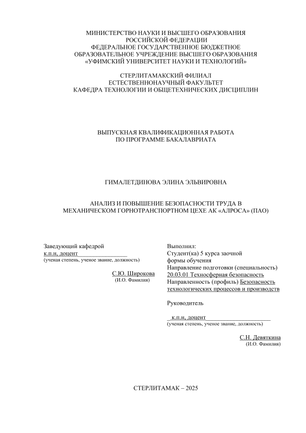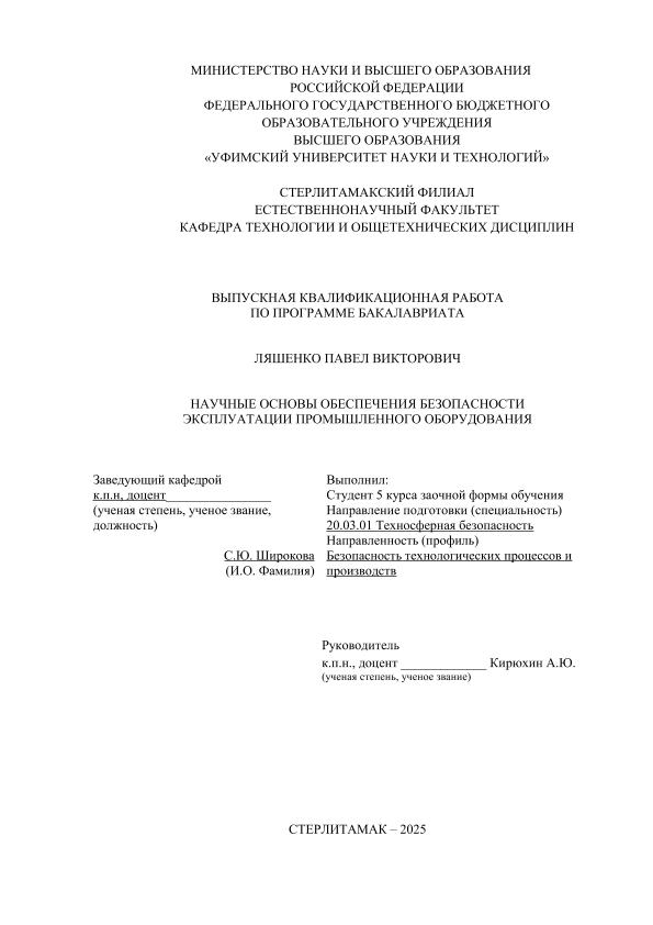 Охрана труда; бакалавриат; ВКР; безопасность эксплуатации промышленного оборудования
