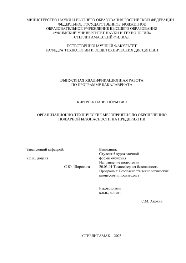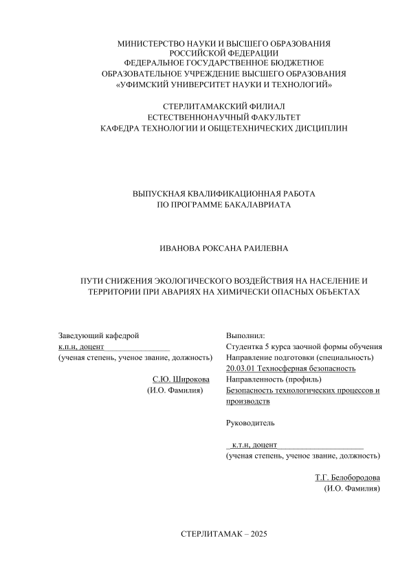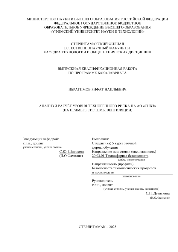 Охрана труда; бакалавриат; ВКР; техногенный риск