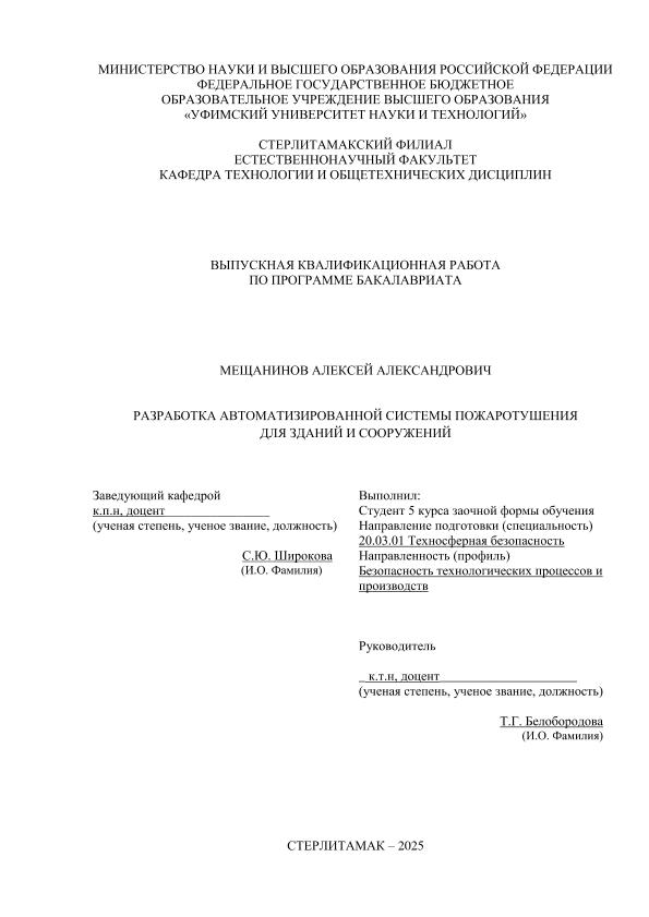 Пожарная безопасность; бакалавриат; ВКР; системы пожаротушения
