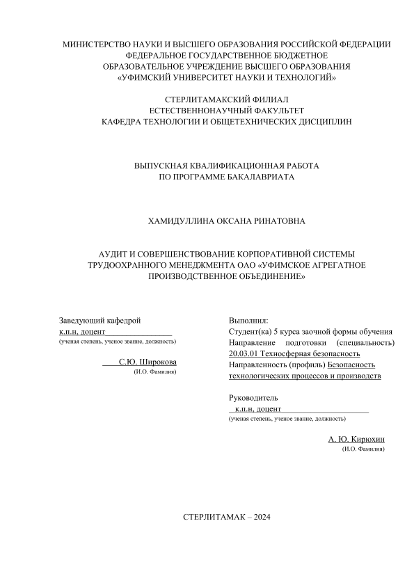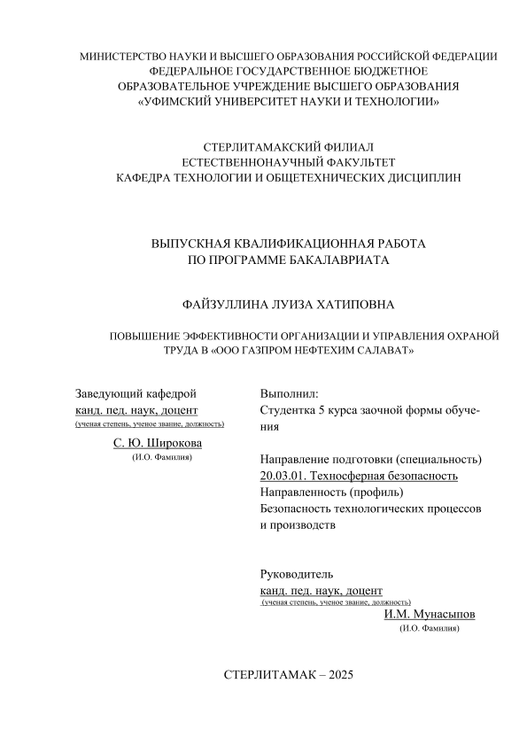 Охрана труда; бакалавриат; ВКР; управление охраной труда