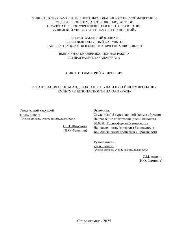 Охрана труда; бакалавриат; ВКР; культура безопасности