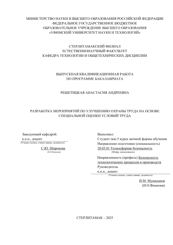 Охрана труда; бакалавриат; ВКР; специальная оценка условий труда