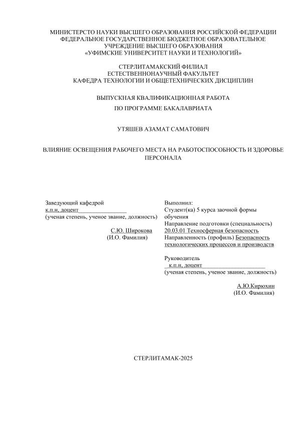 Охрана труда; бакалавриат; ВКР; освещение рабочего места