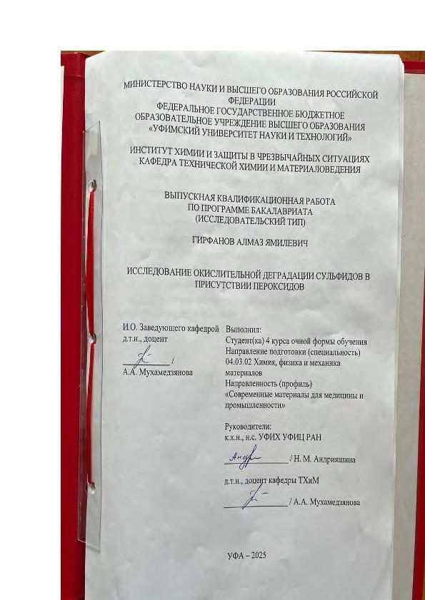 ВКР; бакалавриат; окисления сульфидов; стехиометрия реакции окисления; кинетика образования сульфоксидов; пероксиды; методика анализа дигидропероксидов