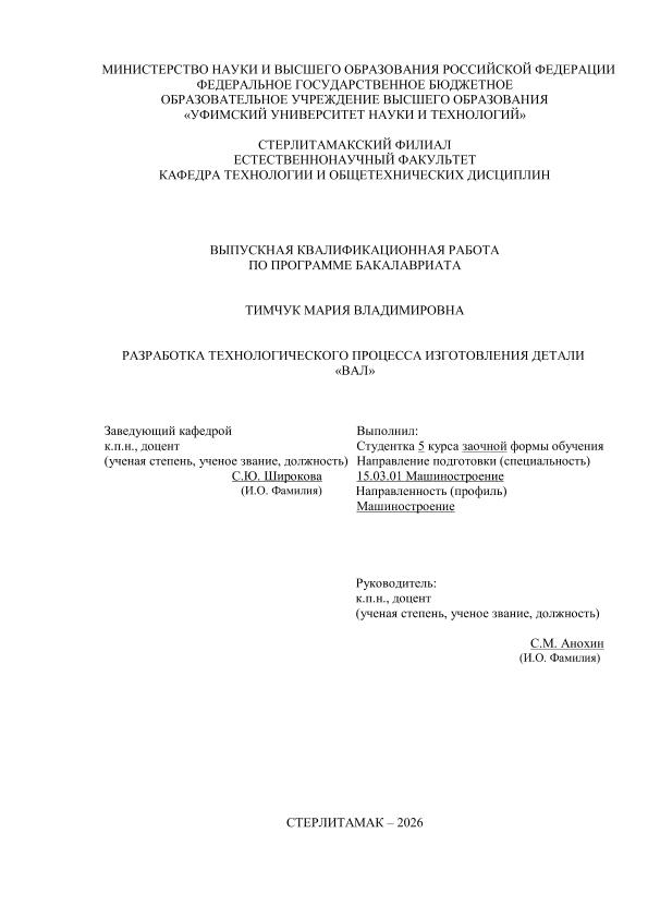 Техника; бакалавриат; ВКР; изготовление детали «Вал»
