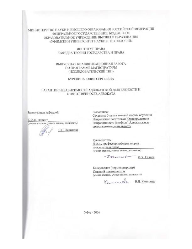 ВКР; магистратура; адвокатская деятельность; независимость; ответственность адвоката; дисциплинарная ответственность