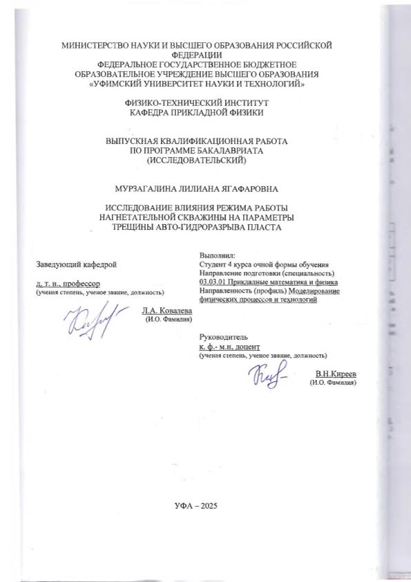 ВКР; бакалавриат; гидродинамические исследования скважин; уравнение Дарси; трещины авто-гадроразрыва пласта; нагнетательная скважина