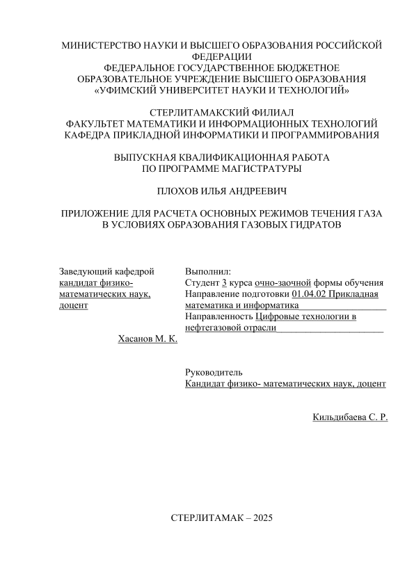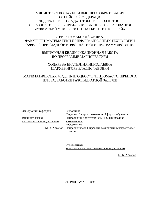 ВКР; магистратура; газовые гидраты; моделирование