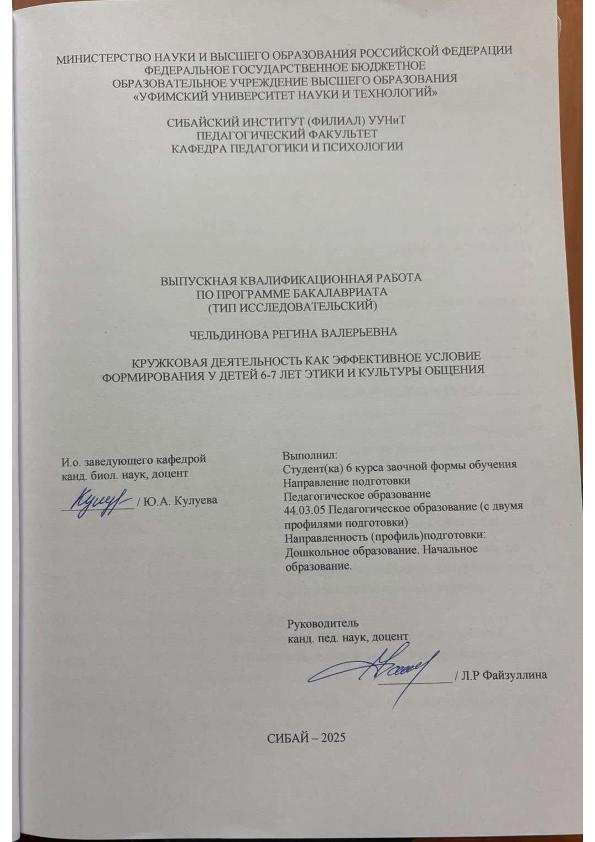 Чельдинова, Р.В. Кружковая деятельность как эффективное условие формирования у детей 6-7 лет этики и культуры общения.: выпускная квалификационная работа по специальности дошкольное образование. Начальное образование / Р.В. Чельдинова; Уфимский университет науки и технологий, Сибайский филиал ;научный редактор Л.Р. Файзуллина. — Сибай, 2025. — с. 83: ил. — <URL:https://elib.bashedu.ru/dl/diplom/2025/CheldinovaRV_44.03.05_DONO_bak_2025.pdf>.