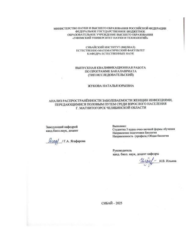 Жукова, Наталья Юрьевна. Анализ распространённости заболеваемости женщин инфекциями, передающимися половым путем среди взрослого населения г. Магнитогорск Челябинской области: выпускная квалификационная работа по программе бакалавриата. Направление подготовки ( специальность) : 06.03.01 Биология.Направленность (профиль) Общая биология ["Электронный ресурс"] / Жукова Наталья Юрьевна; Уфимский университет науки и технологий, Сибайский филиал ; Кафедра естественных наук, научный руководитель Ильина И.В. — Сибай, 2025. — с.44: ил. — <URL:https://elib.bashedu.ru/dl/diplom/2025/ZhukovaNY_06.03.01_Biology_bak_2025.pdf>.