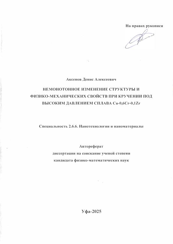 Аксенов, Денис Алексеевич. Немонотонное изменение структуры и физико-механических свойств при кручении под высоким давлением сплава Cu-0,6Cr-0,1Zr: автореферат на соискание ученой степени кандидата физико-математических наук: 2.6.6. Нанотехнологии и наноматериалы / Д.А. Аксенов; Уфимский федеральный исследовательский центр Российской Академии наук; научный руководитель С.Н. Фаизова. — Уфа, 2025. — 20 с. — Защищена при УУНиТ. — Электрон. версия печ. публикации. — Доступ возможен через Электронную библиотеку УУНИТ. — <URL:https://elib.bashedu.ru/dl/corp/AksenovDA_Nemonoton.izmen.strukt.i fiz.-meh.svoistv_avtoref_2025.pdf>. — Текст: электронный