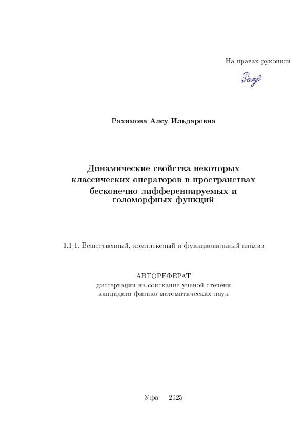 Рахимова, Алсу Ильдаровна. Динамические свойства некоторых классических операторов в пространствах бесконечно дифференцируемых и голоморфных функций: автореферат на соискание ученой степени кандидата физико-математических наук: 1.1.1. Вещественный, комплексный и функциональный анализ / А.И. Рахимова; Уфимский федеральный исследовательский центр Российской Академии наук; научный руководитель И.Х. Мусин. — Уфа, 2025. — 21 с. — Защищена при УУНиТ. — Электрон. версия печ. публикации. — Доступ возможен через Электронную библиотеку УУНИТ. — <URL:https://elib.bashedu.ru/dl/corp/RahimovaAI_Dinam.svoistva nekotor.klas.operatorov v prostranstv._avtoref_2025.pdf>. — Текст: электронный