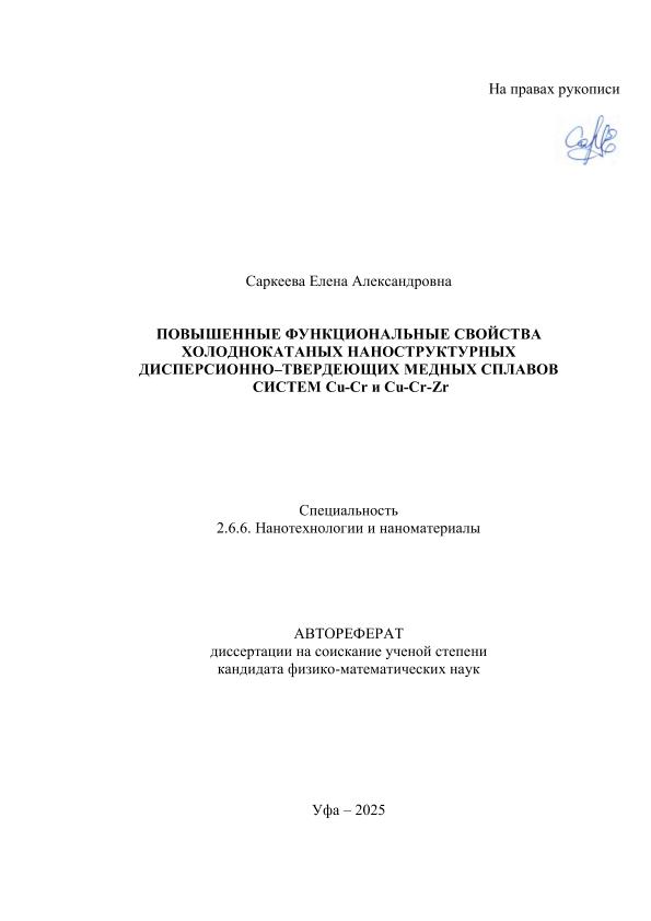 Саркеева, Елена Александровна. Повышенные функциональные свойства холоднокатаных наноструктурных дисперсионно-твердеющих медных сплавов систем Cu-Cr и Cu-Cr-Zr: автореферат на соискание ученой степени кандидата физико-математических наук: 2.6.6. Нанотехнологии и наноматериалы / Е.А. Саркеева; Уфимский университет науки и технологий; научный руководитель И.В. Александров. — Уфа, 2025. — 41 с. — Защищена при УУНиТ. — Электрон. версия печ. публикации. — Доступ возможен через Электронную библиотеку УУНИТ. — <URL:https://elib.bashedu.ru/dl/corp/SarkeevaEA_Povish.funkcional.svoistva holodnokat.nanostr.disp-tverd.med.spl._avtoref_2025.pdf>. — Текст: электронный