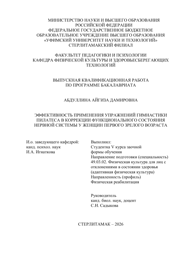 Абдуллина, Айгиз Дамировна. Эффективность применения упражнений гимнастики Пилатеса в коррекции функционального состояния нервной системы у женщин первого зрелого взраста [Электронный ресурс]: выпускная квалификационная работа бакалавра по направлению подготовки 49.03.02 Физическая культура для лиц с отклонениями в состоянии здоровья (Адаптивная физическая культура). Программа: Физическая реабилитация / А. Д. Абдуллина; Уфимский университет науки и технологий, Стерлитамакский филиал, Факультет педагогики и психологии, Кафедра физической культуры и здоровьесберегающих технологий, научный руководитель С. Н. Садыкова. — Стерлитамак, 2026. — 42 с. — <URL:https://elib.bashedu.ru/dl/diplom/SF/2026/FPIP/AbdullinaAD_49_03_02_ZSAFK53_bak_2026_VKR.pdf>. — текст: электронный